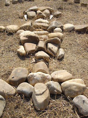 La tierra muestra los habituales tonos tostados tras soportar el sol de todo el verano. Y han pasado más de dos meses y medio desde la última vez que visité a Aztruvio y apenas se ha movido una piedra. Extraño. Pregunto a Aziz si su rebaño ya no pasta por allí. Me dice que sí. Entonces, las ovejas al fin están respetando la composición de Aztruvio, pienso. Me encanta recoger los cambios que sufren las obras que dejo en el campo abierto, significa que están vivas, pero me estremezco si no han cambiado. Eso ya me deja de piedra.